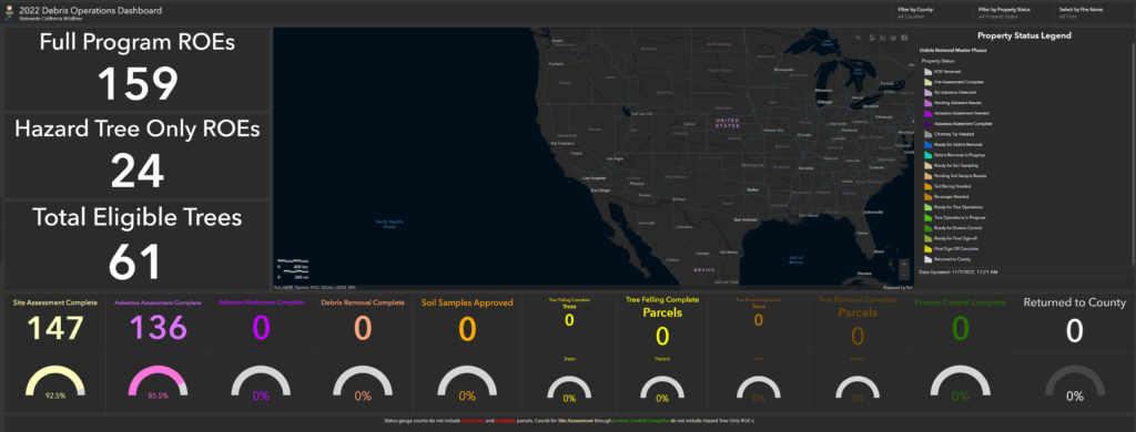 The Debris Operations Dashboard for the Mountain, Mill, and McKinney wildfires is updated every hour and provides users with the ability to sort by branch or county via the filters at the top of the page. Users can also search by address via the magnifying glass icon at the top of the map to access the debris removal data of their property.