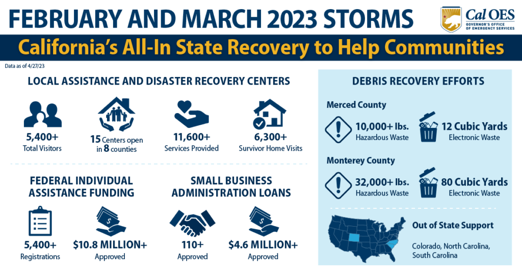 California Governor’s Office of Emergency Services (Cal OES) continues its all-in mission alongside partner agencies to support recovery efforts of local communities to the 2023 February and March Storms.