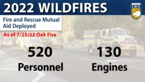 The California Governor’s Office of Emergency Services (Cal OES), in conjunction with state, local and federal partners, is coordinating the deployment of mutual aid resources in support of the Oak Fire in Mariposa County. As of July 25, Cal OES has deployed 130 local... Read MoreRead more about Cal OES Deploys Mutual Aid Resources to Fast-Moving Oak Fire in Mariposa County – July 25, 2022