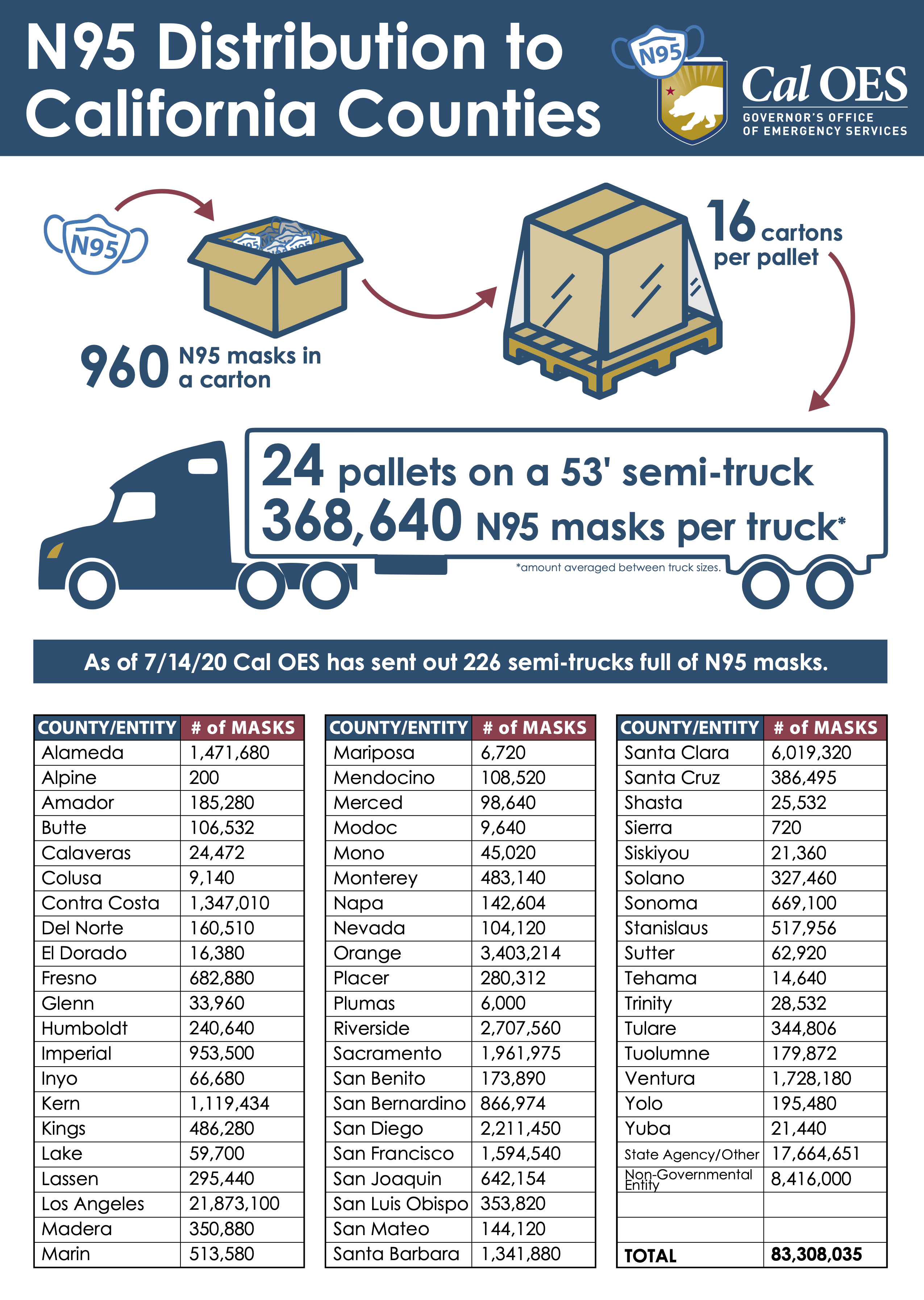 Cal OES continues its mission alongside partnering agencies to support counties across the state, responding to COVID-19. During this pandemic, Cal OES has shipped out millions of N95 masks to multiple front-line sectors. This continuous effort helps jurisdictions stay safe during these unprecedented times.