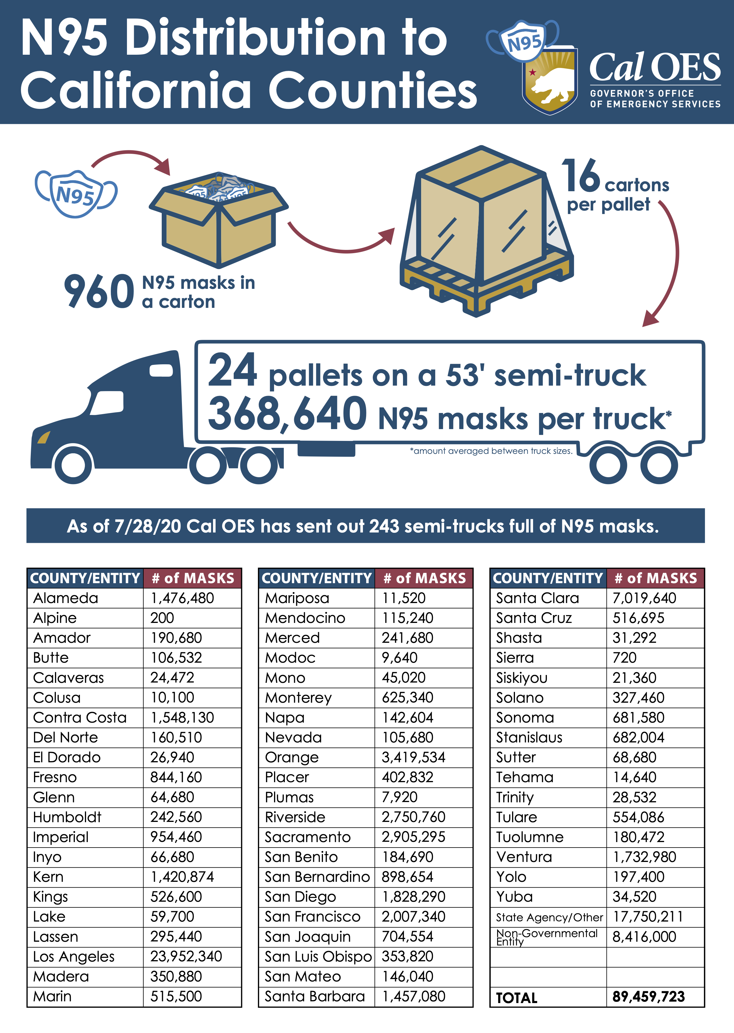 Cal OES continues its mission alongside partnering agencies to support counties across the state, responding to COVID-19. During this pandemic, Cal OES has shipped out millions of N95 masks to multiple front-line sectors. This continuous effort helps jurisdictions stay safe during these unprecedented times.