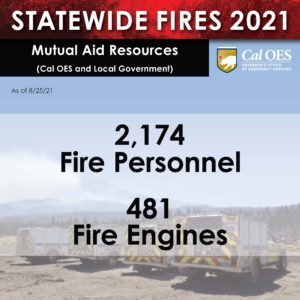 As of August 25, there are 481 total mutual aid engines committed to fires statewide – the highest peak to date. Of those, 315 are local government engines and 166 directly from Cal OES. Nearly 2,200 firefighting personnel are deployed throughout the state.