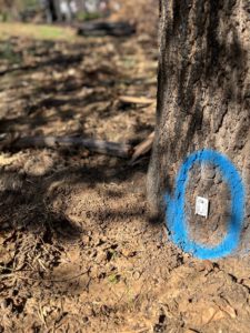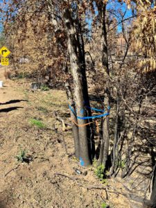 Trees that are deemed hazardous are marked with blue spray paint and wrapped with blue tape.