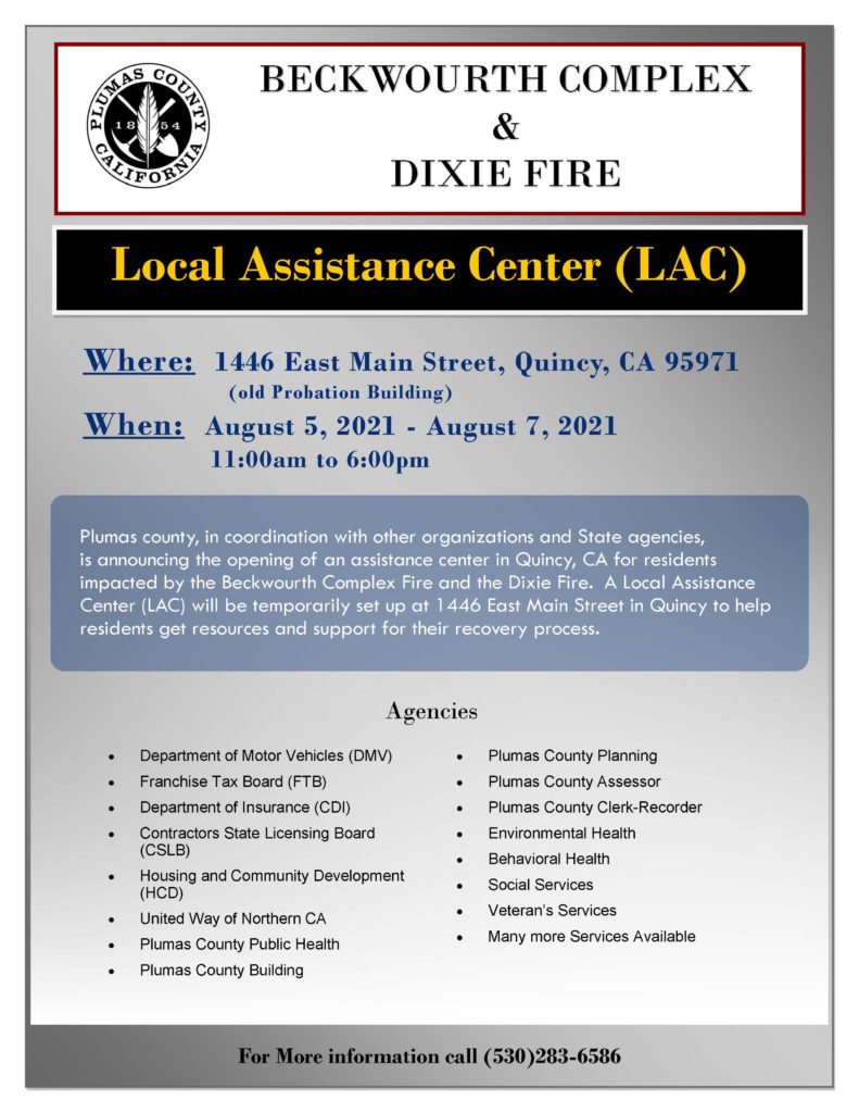 **UPDATE** Local Assistance Center Opens for Plumas County Residents Affected by the Beckwourth Complex and Dixie Fires