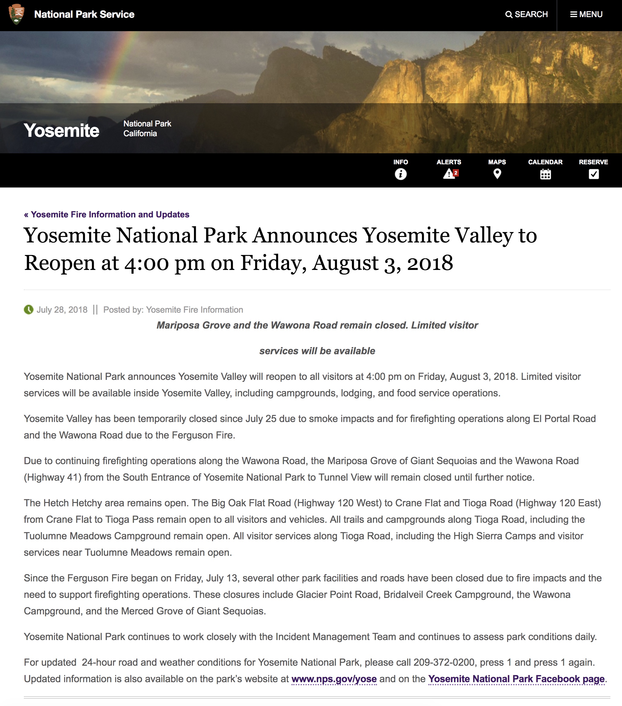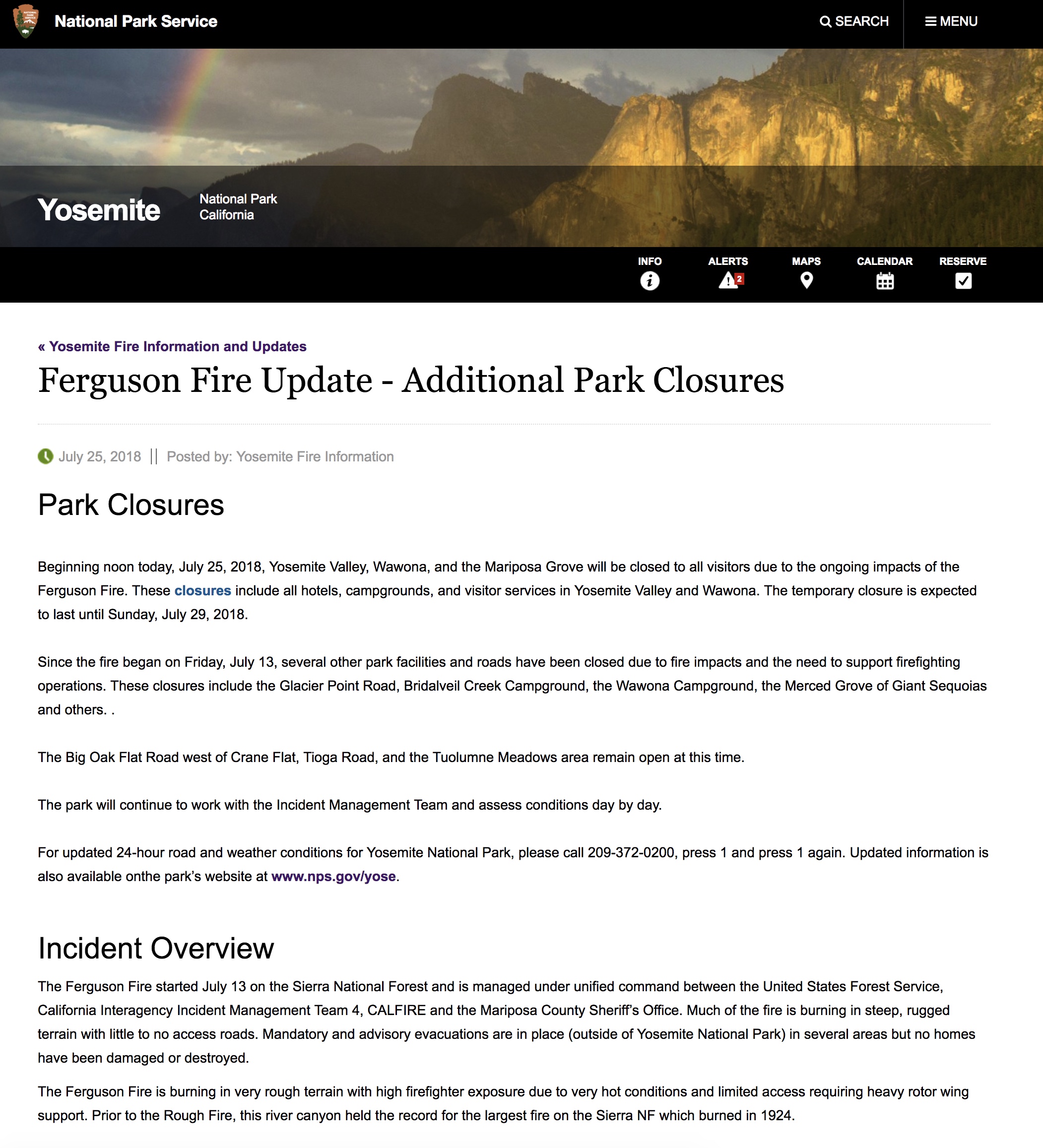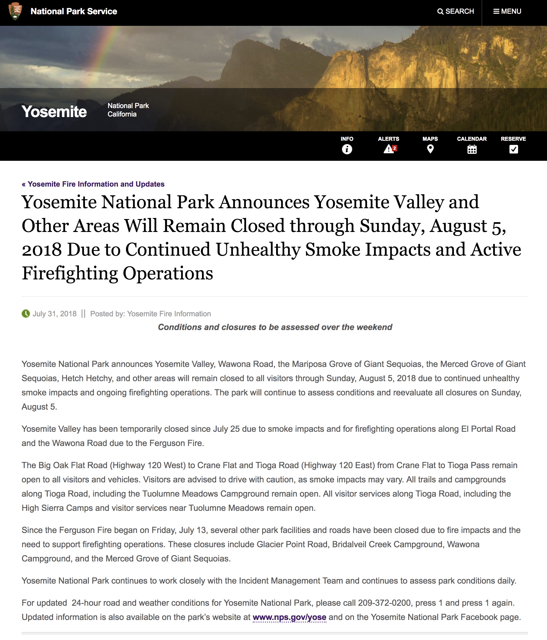 According to the national Park Service, Yosemite National Park was first protected in 1864 and is best known for its waterfalls, but within its nearly 1,200 square miles, you can find deep valleys, grand meadows, ancient giant sequoias and a vast wilderness area. Recently, Yosemite is also known for its wildfires, the Rim Fire in 2013 and the Ferguson Fire in July and August of 2018.