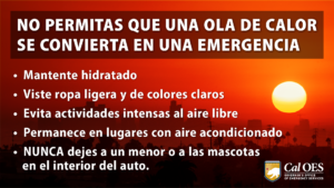Durante los próximos días experimentaremos de nueva cuenta temperaturas de 3 dígitos en varias partes del estado dorado, por ello, la Oficina de Servicios de Emergencia del Gobernador de California (Cal OES) les recuerda algunas medidas básicas y que todos conocen, para que se protejan y cuiden de sus seres queridos, amigos, vecinos y mascotas.