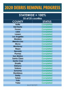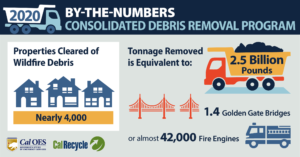 SACRAMENTO – Even as debris removal on this year’s fires is about to get underway, California Governor’s Office of Emergency Services (Cal OES) and California Department of Resources Recycling and Recovery (CalRecycle) have reached a huge milestone in cleaning wildfire debris from last year’s record fire season.
