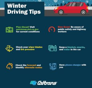 Drivers are always encouraged to be alert, safe and aware of their surroundings during normal conditions and this advice is even more important during inclement weather. During a storm, try to avoid unnecessary driving. If you must be on the roads, California Department of Transportation (Caltrans) has winter driving tips to help you stay safe:
