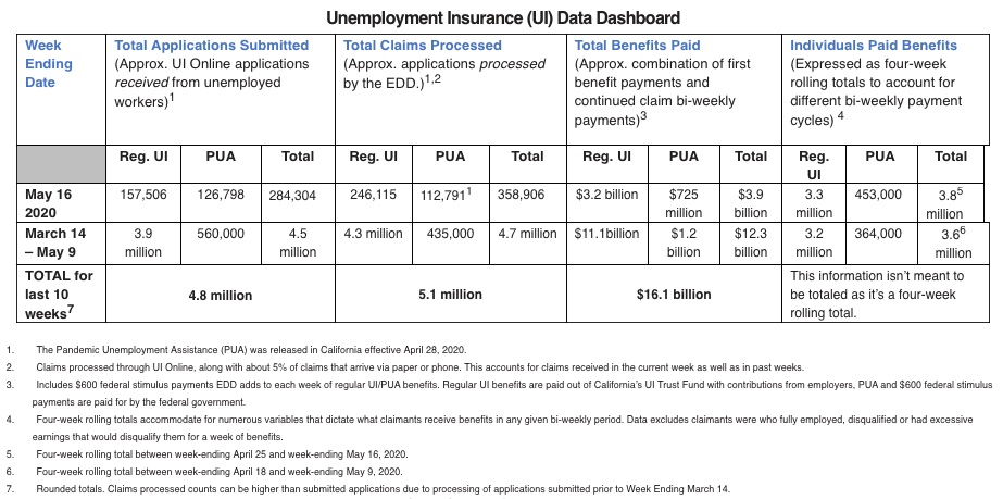 Sacramento – Today, the Employment Development Department (EDD) announced that $3.9 billion in unemployment benefits was paid to California workers impacted by the COVID-19 pandemic last week. This brings the total to $16.1 billion since a surge in demand for unemployment assistance began during the week ending on March 14, 2020. According to the latest data from EDD, a total of 5.1 million claims have been processed over that same timeframe.